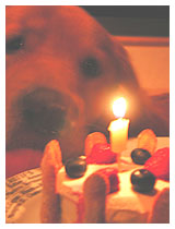 プラウスのために作ってあげた ワンちゃんが食べられるバースデーケーキ 数字の1の形のろうそくを灯して プラウス笑顔で記念撮影のはずが。。 ぶーちゃんが横から出て来て バースデーケーキをなめようとしてる!!